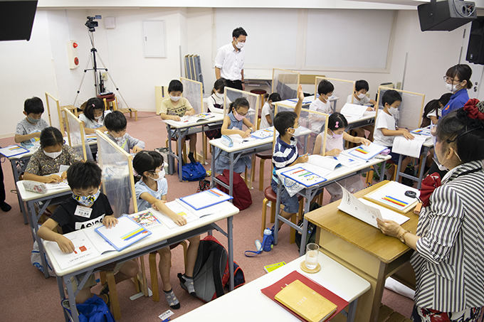 今回の算数では、面積と時間の概念について勉強を行いました。面積定規という実際の1㎤の教具を使い、面積を実態としてとらえていき、”公式だけではなく目で見て理解する”という先生からの言葉を受け止め、テキストの上に必死に面積定規を並べる子どもたち。それを並び終えたときに面積というものの原理原則が潜在意識に深く入っていきます。