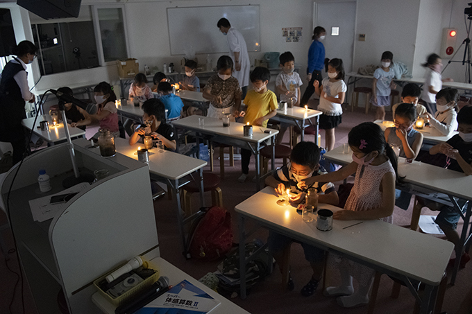 2年生は、物の燃焼実験を行いました。2種類の大きさの違う集気ビンでは火の燃え方はどう変化するのかといった、物の燃焼に必要な条件や気体を考えていきました。