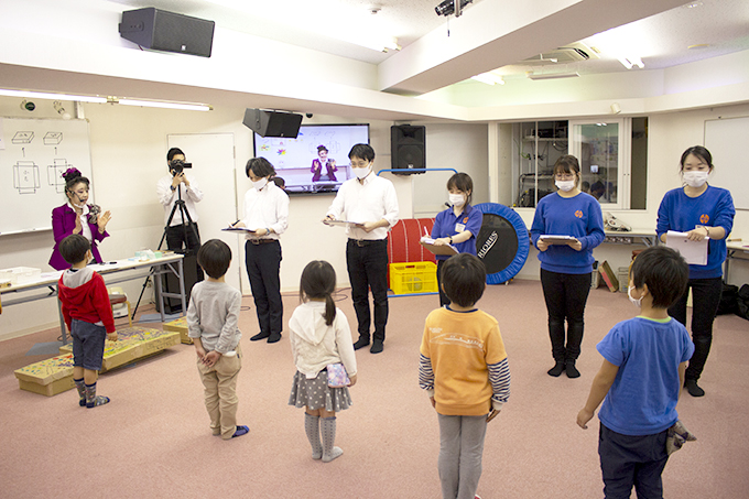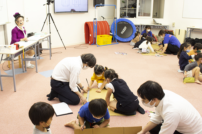 集団行動では私たちの街の絵を描きました。班に分かれて相談しながら、模造紙いっぱいに自分たちの考える街の様子を描いていきました。どの班もとても素敵な作品に仕上がり、子どもたちも嬉しそうでした。