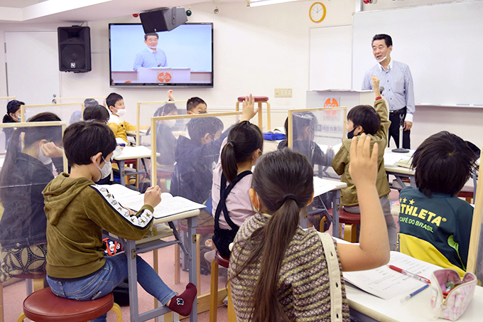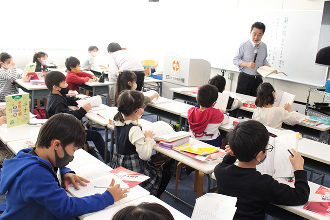 その後、全員で声を合わせて改めて文章を読んでいきました。全て読み終わった後は設問に答えていきました。真面目な質問の間に理事長先生のジョークが加わり、常に楽しい雰囲気で授業が進んでいきました。子どもたちが本当に楽しそうに積極的に意見を述べている姿がとても印象的でした。