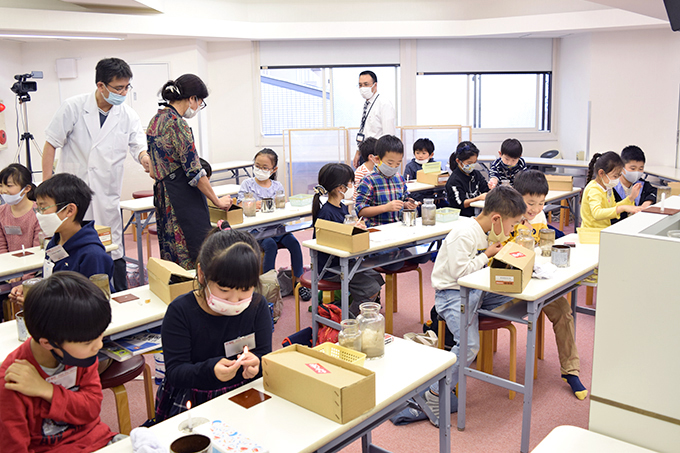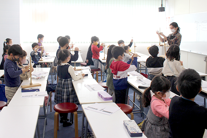 「燃焼実験用円筒」を用いて、燃焼には酸素が必要であるということを、複数のパターンのシチュエーションを作り、検証していきました。何秒で消えるのか、という検証をしましたが、教室中に「1、2、3、4、…」と数える声が響いていました。いつも何事にも全力で取り組む子どもたちの姿が垣間見れました。