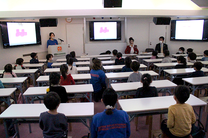 まず、子どもたちは大きな声であいさつして入室し、代表から一人ずつ名前を呼ばれ、出席を行いました。その後は、正しい立ち方、座り方の練習や物の出し入れの仕方を教わりました。沢山の講師と保護者に囲まれ、緊張感溢れる空間でしたが、どの生徒も指示を聞き逃さないよう集中していました。行動もとても速く、初回とは思えないほどでした。